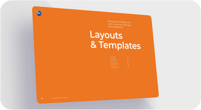 Principles, templates and tools to execute with ease and consistency. Layouts & Templates Overview 46 Full Bleed 49 Macro Circles 51 Full Circles 53 Content-Driven 56 Circle Grid 57 Layout Do Nots 59 50 P&G Corporate VIS ID Guidelines