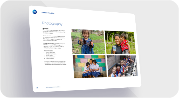 Assets & Principles Photography Citizenship Citizenship photography should show people in a real life moment or relate directly to a P&G Citizenship program. People should have a sense of optimism and be captured in their authentic environment. They may be engaged in an activity or interacting with each other. Program photography may feature program branding or assets. P&G packaging or products that are not natural to the story or moment should not be included. Overall Principles • Natural, authentic • Caught in a moment • Sun-lit, warm • In an environment • Global diversity To source approved photography, visit P&G BrandStore or contact the Brand Manager, Brand Design or Communications Manager. 26 P&G Corporate VIS ID Guidelines