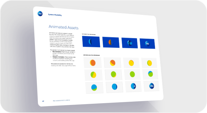System Flexibility Animated Assets Animation activates our system in digital FLIP ANIMATION STORYBOARD formats. The overall style of our animation is natural in movement and speed. Animation uses the circle to tell a story using color, pattern, logos and photography. Content for the animation can be customized to support a speci昀椀c topic or to tell a more overarching P&G story. Animation may also use color or pattern only with the P&G logo. Two styles of animations have been created: • Flip Animation: Flips through content in smooth transitions and resolves to the ROTATING ANIMATION STORYBOARD P&G logo. • Rotation Animation: Revolves the circle in a 昀氀uid movement revealing new content and resolving to the P&G logo. Templates are available for the 昀氀ip and rotating animation. See page 60 for contacts. 47 P&G Corporate VIS ID Guidelines