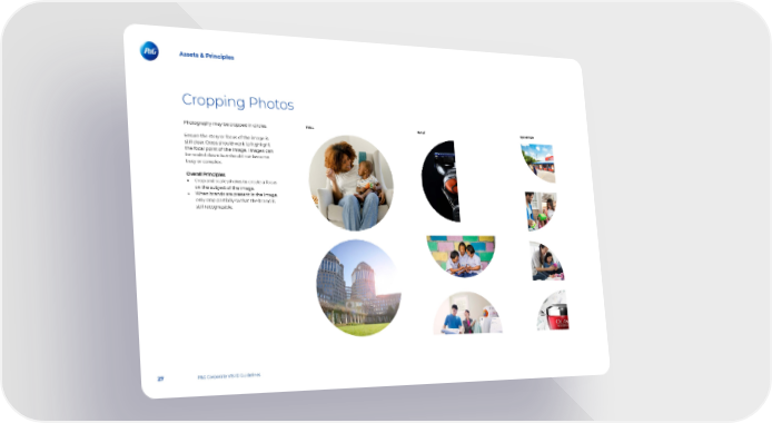 Assets & Principles Cropping Photos FULL HALF QUARTER Photography may be cropped in circles. Ensure the story or focus of the image is still clear. Crops should work to highlight the focal point of the image. Images can be scaled down but should not become busy or complex. Overall Principles • Crop and scale photos to create a focus on the subject of the image. • When brands are present in the image, only crop partially so that the brand is still recognizable. 27 P&G Corporate VIS ID Guidelines