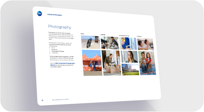 Assets & Principles Photography Photography brings emotion, empathy, BRAND CONSUMER EMPLOYEES & FACILITIES CITIZENSHIP and connection to our communications. All photography should feel bright, positive and authentic with a clear focal point and simple story. Photography should always complement the communication and can be one of the following: • Brand • Consumer • Employees & Facilities • Citizenship To source approved photography, visit P&G BrandStore or contact the Brand Manager, Brand Design or Communications Manager. Visit the P&G Corporate Photography Library for fully licensed consumer and employee imagery. 22 P&G Corporate VIS ID Guidelines