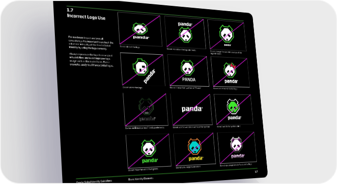 1.7 1.7 Incorrect Logo Use For maximum impact and overall consistency, it is important to protect the value and integrity of the Panda Global identity by using the logo correctly. Always reproduce the logo from original artwork files, and avoid improper logo usage such as illustrated here. These examples apply to all Panda Global logos. Panda Global Identity Guidelines Brand Identity Elements Do not use unapproved effects on the logo Do not change the typeface of “Panda” Do not reposition the logo elements Do not change the size relationships of the logo elements Do not outline any area of the logo elements Do not add elements to the logo Do not use the wordmark without the symbol Do not switch the symbol colors Do not use unapproved colors Do not make the wordmark green Do not distort the logo PANDA Do not rotate the logo