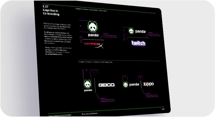 1.17 1.17 Logo Use in Co-branding The Panda Global Logo can be used with sponsor / partner logos in either of the two configurations shown here. For all sponsor / partner lockups, the Panda Global logo should always appear above or to the left of any other logo and should be of similar visual weight. A fine line weight, as shown here, separates the two logos. Always refer to guideline specifications on pages 1.4-1.6 for clear space minimum size, and page 1.11 for use on various backgrounds. Panda Global Identity Guidelines B rand Identity Elements Line length: 150% scale of height of logo Line weight shown here: 0.5pt Line length: 125% scale of width of logo Line weight shown here: 0.5pt X X .25X .5X .25X .5X Examples of Sponsor Lockup Vertical Configuration Examples of Sponsor Lockup Horizontal Configuration X X .5x .5x .5x .5x Line length: 125% scale of height of logo Line weight shown here: 0.5pt Line length: 125% scale of height of logo Line weight shown here: 0.5pt