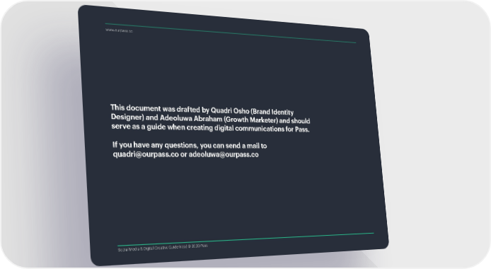 This document was drafted by Quadri Osho (Brand Identity Designer) and Adeoluwa Abraham (Growth Marketer) and should serve as a guide when creating digital communications for Pass. If you have any questions, you can send a mail to [email protected] or [email protected] www.ourpass.co Social Media & Digital Creative Guidelines | © 2020 Pass