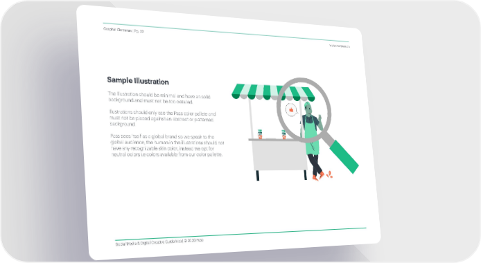 The illustration should be minimal and have an solid background and must not be too detailed. Illustrations should only use the Pass color pallete and must not be placed against an abstract or patterned background. Pass sees itself as a global brand so we speak to the global audience, the human in the illustrations should not have any recognizable skin color, instead we opt for neutral colors i.e colors available from our color pallette. Graphic Elements | Pg. 22 www.ourpass.co Social Media & Digital Creative Guidelines | © 2020 Pass Sample Illustration