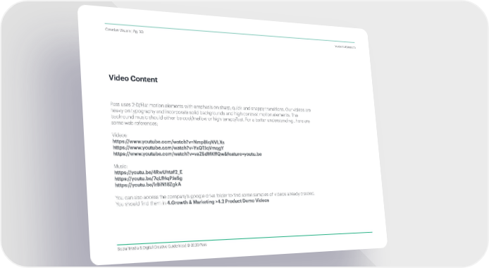 Pass uses 2D/Flat motion elements with emphasis on sharp, quick and snappy transitions. Our videos are heavy on typography and incorporate solid backgrounds and high contrast motion elements. The backround music should either be cool/mellow or high tempo/fast. For a better understanding , here are some web references; Videos: https://www.youtube.com/watch?v=NmpBIqNVLXs https://www.youtube.com/watch?v=YxQ7JqVmqgY https://www.youtube.com/watch?v=vaZSdMKffQw&feature=youtu.be Music: https://youtu.be/4RwUhtaf2_E https://youtu.be/7qLfHqPJaSg https://youtu.be/lrBiN18ZgkA You can also access the company’s google drive folder to ind some samples of videos already created. You should ind them in 4.Growth & Marketing >4.2 Product Demo Videos Creative Visuals | Pg. 30 www.ourpass.co Social Media & Digital Creative Guidelines | © 2020 Pass Video Content