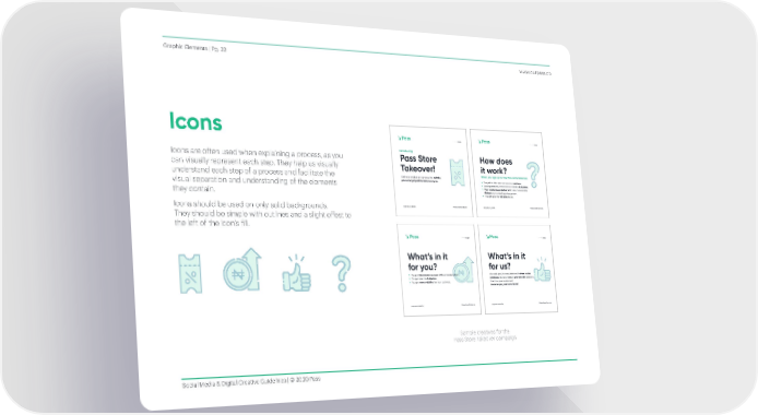 Icons Icons are often used when explaining a process, as you can visually represent each step. They help us visually understand each step of a process and facilitate the visual separation and understanding of the elements they contain. Icons should be used on only solid backgrounds. They should be simple with outlines and a slight offest to the left of the icon’s ill. Graphic Elements | Pg. 22 www.ourpass.co Social Media & Digital Creative Guidelines | © 2020 Pass Sample creatives for the Pass Store Takeover campaign
