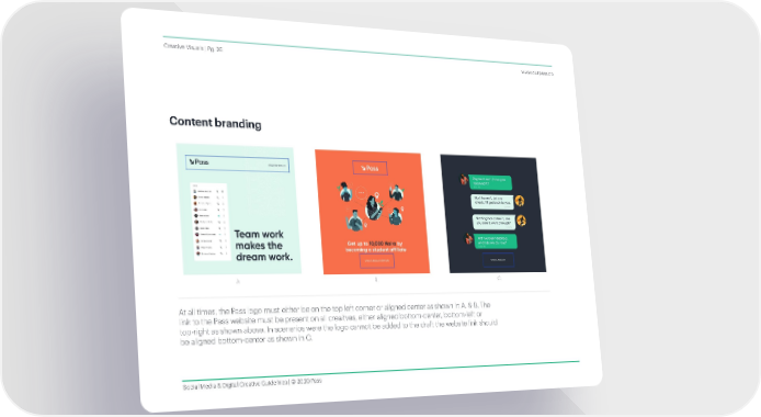At all times, the Pass logo must either be on the top left corner or aligned center as shown in A. & B. The link to the Pass website must be present on all creaitves, either aligned bottom-center, bottom-left or top-right as shown above. In scenerios were the logo cannot be added to the draft the website link should be aligned bottom-center as shown in C. Creative Visuals | Pg. 26 www.ourpass.co Social Media & Digital Creative Guidelines | © 2020 Pass Content branding A. B. C.