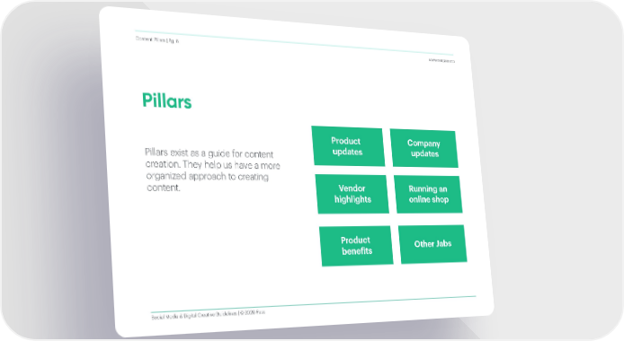 Pillars Pillars exist as a guide for content creation. They help us have a more organized approach to creating content. Content Pillars | Pg. 8 www.ourpass.co Social Media & Digital Creative Guidelines | © 2020 Pass Product updates Company updates Vendor highlights Running an online shop Product beneits Other Jabs