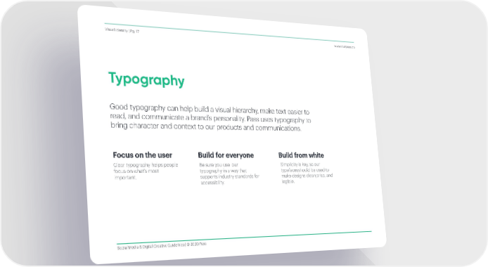 Typography Clear typography helps people focus on what’s most important. Be sure you use our typography in a way that supports industry standards for accessibility. Simplicity is key, so our typefacesshould be used to make designs clean,crisp, and legible. Good typography can help build a visual hierarchy, make text easier to read, and communicate a brand’s personality. Pass uses typography to bring character and context to our products and communications. Visual Identity | Pg. 17 www.ourpass.co Social Media & Digital Creative Guidelines | © 2020 Pass Focus on the user Build for everyone Build from white