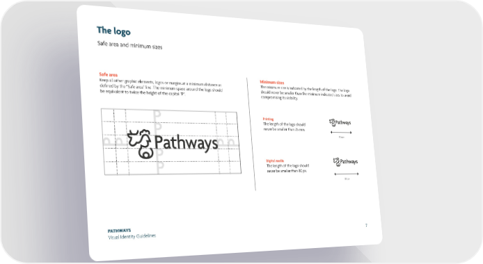 PAT H WAYS Visual Identity Guidelines 7 Safe area and minimum sizes The logo Printing The length of the logo should never be smaller than 25 mm. Digital media The length of the logo should never be smaller than 80 px. 25 mm 80 px Safe area Keep all other graphic elements, logos or margins at a minimum distance as defined by the “Safe area” line. The minimum space around the logo should be equivalent to twice the height of the capital "P". Minimum sizes The minimum size is indicated by the length of the logo. The logo should never be smaller than the minimum indicated sizes to avoid compromising its visibility.