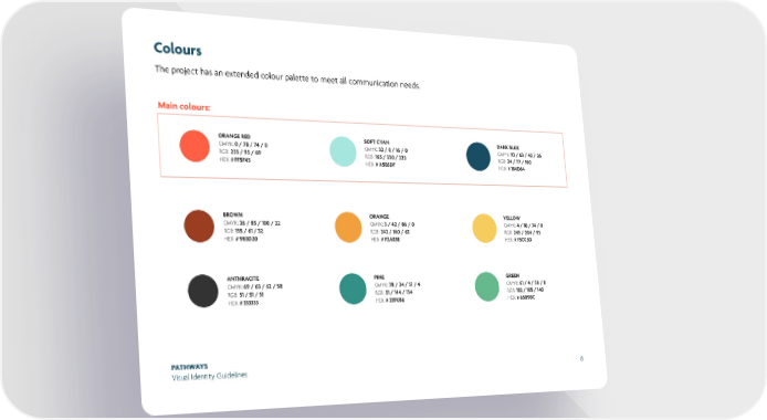 PAT H WAYS Visual Identity Guidelines 8 The project has an extended colour palette to meet all communication needs. Colours ANTHRACITE CMYK: 69 / 63 / 62 / 58 RGB: 51 / 51 / 51 HEX: # 333333 BROWN CMYK: 26 / 85 / 100 / 22 RGB: 155 / 61 / 32 HEX: # 9B3D20 PINE CMYK: 78 / 24 / 51 / 4 RGB: 51 / 144 / 134 HEX: # 339086 ORANGE CMYK: 3 / 42 / 86 / 0 RGB: 242 / 160 / 62 HEX: # F2A03E YELLOW CMYK: 4 / 18 / 74 / 0 RGB: 245 / 204 / 93 HEX: # F5CC5D GREEN CMYK: 61 / 4 / 58 / 0 RGB: 102 / 185 / 140 HEX: # 66B98C ORANGE RED CMYK: 0 / 78 / 74 / 0 RGB: 255 / 95 / 69 HEX: # FF5F45 SOFT CYAN CMYK: 32 / 0 / 16 / 0 RGB: 165 / 230 / 223 HEX: # A5E6DF Main colours: DARK BLUE CMYK: 93 / 63 / 42 / 26 RGB: 24 / 77 / 100 HEX: # 184D64