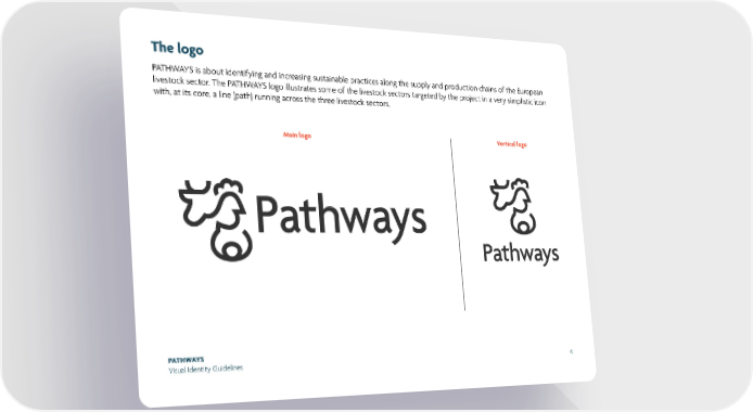 PAT H WAYS Visual Identity Guidelines 4 PATHWAYS is about identifying and increasing sustainable practices along the supply and production chains of the European livestock sector. The PATHWAYS logo illustrates some of the livestock sectors targeted by the project in a very simplistic icon with, at its core, a line (path) running across the three livestock sectors. The logo Main logo Vertical logo