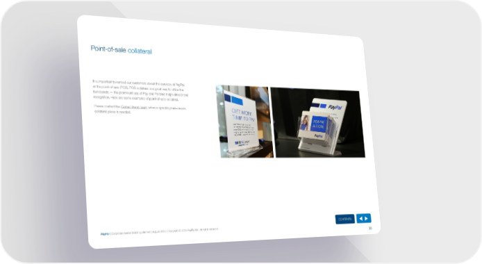 Point-of-sale collateral It is important to remind our customers about the services of PayPal at the point-of-sale (POS). POS collateral is a great way to utilize the twin bands — the prominent use of Pay and Pal blue helps drive brand recognition. here are some examples of point-of-sale collateral. Please contact the Global Brand Team when a specific point-of-sale collateral piece is needed. ContentS PayPal | Corporate master brand guidelines | August 2013 | Copyright © 2013 PayPal Inc. All rights reserved. 30
