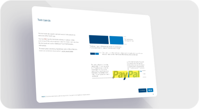 Twin bands The twin bands are a graphic element based off of the proportions and colors of the PayPal logo. Twin bands shown you may ONLy use the twin bands externally in signage, in store, at a height of 1 inch point of sale (POS), and acceptance marks. for internal communications the twin bands are used on letterhead, PowerPoint templates, and signage. Twin bands images in EPS format are available for download and may be scaled from 0.25 inches to 10 inches based on height. To ensure global consistency, foundational vector art files of the twin bands are available for download from PayPal Brand Central. The minimum size of the twin bands is determined by the height, which may not be less than 0.25 inches and the minimum size of the radii may not be less than 2pt. The height and width of the bands is based on the “Pay” and “Pal” The corner radii mirrors that of the elements of our logo. The distance corners of the “P” in our logo when between them is set between the the “P” and the band are both the “y” and the second “P” as shown. same height. you may use this guideline if you have to create new twin bands. The standard corner radius is set at 4 points for a 1-inch 1 inch band height. ContentS PayPal | Corporate master brand guidelines | August 2013 | Copyright © 2013 PayPal Inc. All rights reserved. 9