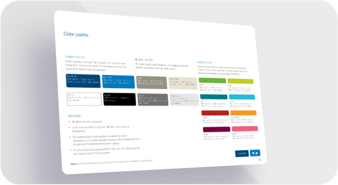 Color palette PrIMAry PALETTE NEuTrAL PALETTE ACCENT PALETTE PayPal signature colors are “Pay” blue and “Pal” blue on a white The neutral palette is intended to be used sparingly to organize use the accent palette to create visual interest and engagement. background. These should always be considered as the primary information and create functional environments. Please note the color pairings, the colors that appear next to one colors. Black is to be used very sparingly. another are intended to be used together, DO NOT mix. PAy BLuE PAL BLuE SAND PALE SAND PMS: 295 PC / rGB: 0 69 124 PMS: 300 PC / CMyK: 100 44 0 0 PMS: 416 PC / CMyK: 0 0 16 50 PMS: 454 PC / CMyK: 9 6 17 0 CMyK: 100 57 0 40 / hEX: 00457C rGB: 0 121 193 / hEX: 0079C1 rGB: 149 148 132 / hEX: 959484 rGB: 231 229 211 / hEX: E7E5D3 LEAf LIME PMS: 396 PC / CMyK: 59 0 100 7 PMS: 390 PC / CMyK: 22 0 100 8 rGB: 109 179 63 / hEX: 6DB33f rGB: 194 205 35 / hEX: C2CD23 WhITE BLACK SLATE PALE SLATE CMyK: 0 0 0 0 / rGB: 255 255 255 CMyK: 0 0 0 100 / rGB: 0 0 0 PMS: COOL GrAy 11 PC / PMS: COOL GrAy 2 PC hEX: ffffff hEX: 000000 CMyK: 0 2 0 68 / rGB: 113 112 116 CMyK: 0 0 0 10 / rGB: 230 231 232 SEA AQuA hEX: 717074 hEX: E6E7E8 PMS: 322 PC / CMyK: 100 0 33 35 PMS: 631 PC / CMyK: 67 0 12 2 rGB: 0 124 133 / hEX: 007C85 rGB: 38 188 215 / hEX: 26BCD7 IMPOrTANT TOMATO TANGErINE • DO NOT use tints or gradients. PMS: 484 PC / CMyK: 0 95 100 29 PMS: 144 PC / CMyK: 0 48 100 0 rGB: 179 35 23 / hEX: B32317 rGB: 248 152 29 / hEX: f8981D • Black is for use ONLy in copy text, DO NOT use black as a background. • The neutral palette is best used as a container for text or PLuM BErry infographics, or to create separation against a white uI (user interface). PMS: 229 PC / CMyK: 0 100 15 60 PMS: 198 PC / CMyK: 0 78 33 0 It’s not recommended for primary retail signage. rGB: 122 0 60 / hEX: 7A003C rGB: 241 95 124 / hEX: f15f7C • All colors have been assigned CMyK, rGB and hEX values based on the Pantone Solid to Process system. ContentS PayPal | Corporate master brand guidelines | August 2013 | Copyright © 2013 PayPal Inc. All rights reserved. 18
