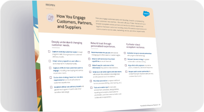 REOPEN How You Engage How you engage customers starts with listening. Invest in understanding your customers’ new realities – the work will pay off later. Partner with your Customers, Partners, broader ecosystem across partners and vendors to deliver experiences together that meet customers’ evolving needs. Personalize experiences and and Suppliers communication across sales, marketing, service, and other departments. Deeply understand changing Rebuild trust through Cultivate robust customer needs. personalized experiences. ecosystem resilience. Capture evolving customer needs through Recommunicate who you are with evolved Formalize new go-to-market partnerships programmatic focus groups and customer messaging and offers based on market insights. with programs and technology. advisory boards. Advance self-service (and touchless) Reinvent channel strategy for greater Adapt value propositions and offers to capabilities across all channels. collaboration and data sharing. serve near-term market demands. Make it easy for customers to find Align effort with playbooks that define Capture shifts in how customers want to information they want to make decisions. actions, milestones, and what-if responses. engage, including new buying and service experience needs. Script your call center agents and sales teams Deepen public sector partnership for with reopen-the-workplace knowledge base contact tracing to maximize safety at every Evolve data strategy based on new data and AI-powered recommendations. customer touchpoint. requirements to ensure safe physical customer experiences. Prioritize automation to replace inefficient human processes (billing, order tracking, etc.). Establish ethical use advisory board and guidelines to govern health and other Train and enable reps for new sales sensitive data usage. environment: processes, deal guidelines, reporting and analytics, deal/customer prioritization, and new communication and collaboration expectations. The COVID-19 Response Playbook | 23