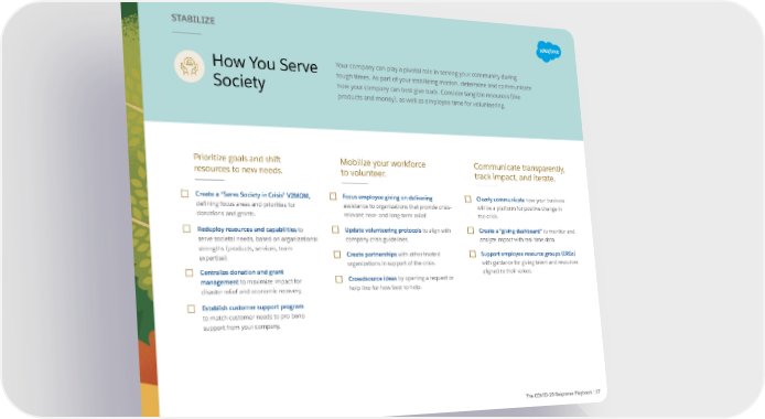 STABILIZE How You Serve Your company can play a pivotal role in serving your community during tough times. As part of your stabilizing motion, determine and communicate Society how your company can best give back. Consider tangible resources (like products and money), as well as employee time for volunteering. Prioritize goals and shift Mobilize your workforce Communicate transparently, resources to new needs. to volunteer. track impact, and iterate. Create a “Serve Society in Crisis” V2MOM, Focus employee giving on delivering Clearly communicate how your business defining focus areas and priorities for assistance to organizations that provide crisis- will be a platform for positive change in donations and grants. relevant near- and long-term relief. the crisis. Redeploy resources and capabilities to Update volunteering protocols to align with Create a “giving dashboard” to monitor and serve societal needs, based on organizational company crisis guidelines. analyze impact with real-time data. strengths (products, services, team expertise). Create partnerships with other trusted Support employee resource groups (ERGs) organizations in support of the crisis. with guidance for giving talent and resources Centralize donation and grant aligned to their values. management to maximize impact for Crowdsource ideas by opening a request or disaster relief and economic recovery. help line for how best to help. Establish customer support program to match customer needs to pro bono support from your company. The COVID-19 Response Playbook | 17