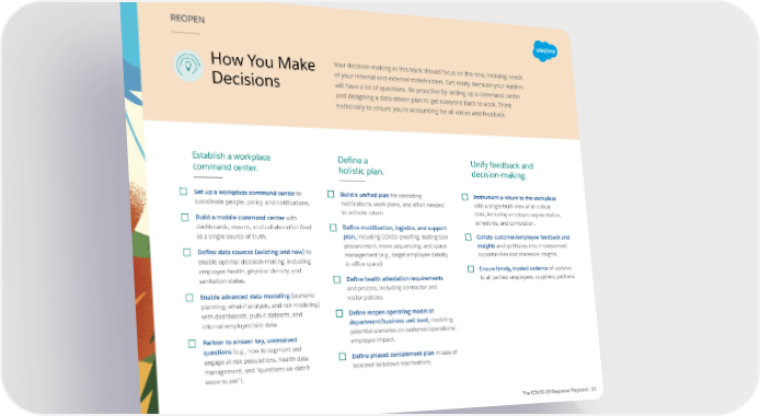 REOPEN How You Make Your decision-making in this track should focus on the new, evolving needs of your internal and external stakeholders. Get ready, because your leaders Decisions will have a lot of questions. Be proactive by setting up a command center and designing a data-driven plan to get everyone back to work. Think holistically to ensure you’re accounting for all voices and feedback. Establish a workplace Define a Unify feedback and command center. holistic plan. decision-making. Set up a workplace command center to Build a unified plan for cascading Instrument a return to the workplace coordinate people, policy, and notifications. notifications, work plans, and effort needed with a single-truth view of all critical to activate return. data, including employee segmentation, Build a mobile command center with schedules, and completion. dashboards, reports, and collaboration feed Define mobilization, logistics, and support as a single source of truth. plan, including COVID-proofing, testing tool Collate customer/employee feedback and procurement, move sequencing, and space insights and synthesize into improvement Define data sources (existing and new) to management (e.g., target employee density opportunities and shareable insights. enable optimal decision-making, including in office space). employee health, physical density, and Ensure timely, trusted cadence of updates sanitation status. Define health attestation requirements to all parties: employees, suppliers, partners. and process, including contractor and Enable advanced data modeling (scenario visitor policies. planning, what-if analysis, and risk modeling) with dashboards, public datasets, and Define reopen operating model at internal employee/site data. department/business unit level, modeling potential scenarios on customer/operations/ Partner to answer key, unresolved employee impact. questions (e.g., how to segment and engage at-risk populations, health data Define phased containment plan in case of management, and “questions we didn’t localized lockdown reactivations. know to ask”). The COVID-19 Response Playbook | 21