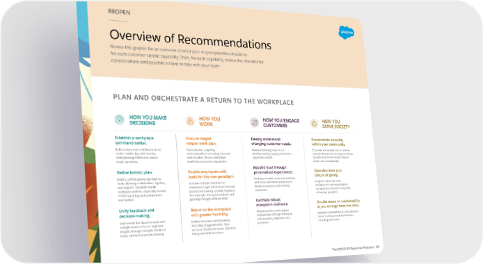 REOPEN Overview of Recommendations Review this graphic for an overview of what your reopen priorities should be for each customer-centric capability. Then, for each capability, review the checklist for considerations and possible actions to take with your team. PLAN AND ORCHESTRATE A RETURN TO THE WORKPLACE HOW YOU MAKE HOW YOU HOW YOU ENGAGE HOW YOU DECISIONS WORK CUSTOMERS SERVE SOCIETY Establish a workplace Execute staged Deeply understand Demonstrate empathy command center. reopen work plan. changing customer needs. within your community. Build a team and mobile command Cascade plan, targeting Deepen listening programs to Empower and enable teams to serve center. Gather key data to help communications according to needs identify evolving buying and service local needs and form local partnerships. with planning. Partner to resolve and situation. Review and adopt experience needs. Invest in and communicate impact tough questions. workforce protection regulations. locally and transparently. Rebuild trust through Define holistic plan. Enable employees with personalized experiences. Operationalize your Build a unified plan to get back to tools for the new paradigm. Redesign simpler, more personalized, culture of giving. work, defining mobilization, logistics, Activate multiple channels for and more automated experiences. Programmatize volunteer and support. Establish overall employees to get information through Enable employees with training management and expand grant workplace policies, especially around portals and training, provide feedback and scripts. management. Commit to equality- COVID-proofing and containment (for example, through a hotline), and enhancing programs. reactivation. get help through wellness tools. Cultivate robust Unify feedback and ecosystem resilience. Double down on sustainability Return to the workplace as you emerge from the crisis. decision-making. with greater flexibility. Deepen partner and supplier relationships through enhanced Establish sustainability as a key decision Instrument the return to work with Enable increased work flexibility, collaboration, playbooks, and factor in all post-crisis investments, a single source of truth, augment including staggered shifts. Take processes. including real estate. insights through multiple feedback account of parental needs. Optimize loops, and communicate liberally. hiring and skills decisions. The COVID-19 Response Playbook | 20