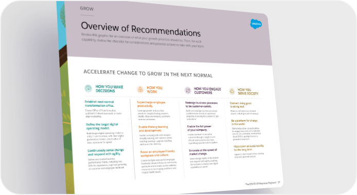 GROW Overview of Recommendations Review this graphic for an overview of what your growth priorities should be. Then, for each capability, review the checklist for considerations and possible actions to take with your team. ACCELERATE CHANGE TO GROW IN THE NEXT NORMAL HOW YOU MAKE HOW YOU HOW YOU ENGAGE HOW YOU DECISIONS WORK CUSTOMERS SERVE SOCIETY Establish next-normal Supercharge employee Redesign business processes Connect doing good transformation office. productivity. to be customer-centric. to doing well. Create Office of Transformation; Leverage growth industry best Audit and redesign business processes Measure and report your societal publish CEO-level vision as true north; practices; simplify finding answers; to differentiate based on speed and impact, including as part of earnings. align leadership. enable citizen developers; automate simplicity in serving the customer’s “job onerous processes. to be done.” Be a platform for change Define the target digital in the world. operating model. Enable lifelong learning Enable the full power and development. of your company. Orchestrate action, via partnerships, Build target digital operating model to to engage executives and employees unify IT and business, with clear digital Enable companywide skills analysis; Enable one team to serve the around UN Sustainable Development governance model; unlock value of simplify learning with tailored online customer through a single source Goals (SDGs); spotlight heroes to data; automate for speed. learning journeys; upgrade reskilling of truth and customer journeys; generate momentum. and source for diversity. supercharge partners and suppliers. Continuously sense change Triple down on sustainability and respond with agility. Foster an employee-friendly Innovate at the speed of for the long term. Define and enable business workplace and culture. market change. Appoint a chief impact officer; develop performance matrix, including new Create multiple avenues for employee Sense change rapidly in the market a net-zero plan and execute. KPIs for experience; augment gathering feedback; enhance focus on community and respond with agility, enabling of customer and employee feedback. and work environment; evolve wellness the business to deploy new digital resources to serve aging workforce and capabilities at speed. mental health issues. The COVID-19 Response Playbook | 27