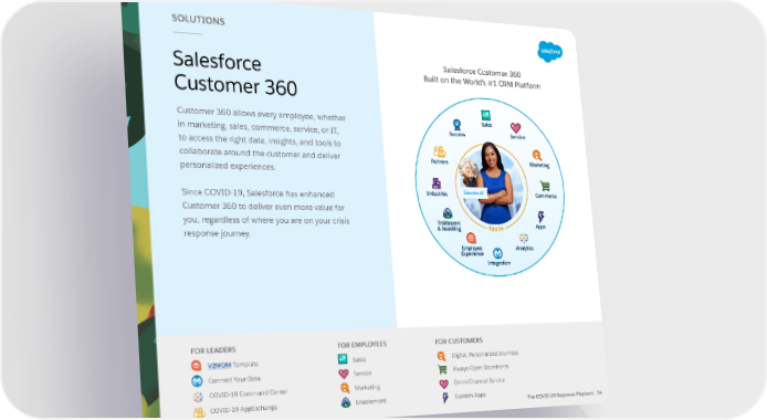 SOLUTIONS Salesforce Customer 360 Salesforce Built on the World’s #1 CRM Platform Customer 360 Salesforce Customer 360 as of 12/03/19 Customer 360 allows every employee, whether Sales in marketing, sales, commerce, service, or IT, Success Service to access the right data, insights, and tools to collaborate around the customer and deliver Platform Partners Marketing personalized experiences. Mobile Blockchain AI Vision Voice Since COVID-19, Salesforce has enhanced Industries Einstein AI Commerce Customer 360 to deliver even more value for Security Privacy Communities Builder Flow & Identity you, regardless of where you are on your crisis Trailblazers Apps response journey. & Reskilling TRUTH Employee Analytics Experience Integration FOR LEADERS FOR EMPLOYEES FOR CUSTOMERS V2MOM Template Sales Digital, Personalized Journeys Connect Your Data Service Always-Open Storefronts COVID-19 Command Center Marketing Omni-Channel Service COVID-19 AppExchange Enablement Custom Apps The COVID-19 Response Playbook | 34