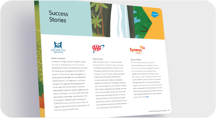 Success Stories Piedmont Health AAA Carolinas Syneos Health In need of a triage process to handle a drastic AAA Carolinas is over 2.1 million members Clinical research firm Syneos Health is increase in inbound calls, Piedmont Health strong, and after it was forced to temporarily supporting those on the frontlines with the partnered with Slalom to implement a solution close retail branches due to COVID-19, 228 launch of an educational program for doctors for tracking and management of COVID-19 employees pivoted from their existing roles around alternatives to ventilators. Using patients. This enabled nurses and agents to to focus on a new member outreach program Salesforce Care solutions and Health Cloud, guide patients through a series of questions using Service Cloud that enabled them the company is able to rapidly spread the word that focused on risk, exposures, and active to create cases and conduct personalized about its BiPAP machines, which help stabilize symptoms to appropriately triage patients outreach to customers. The program was spun intubated patients and can help alleviate the to the right level of care. Slalom created a up in just five days and, one week after kicking need for ventilators. In the future, the company dashboard to track call volume, patient source off, the team completed over 25,000 member plans on using the self-service portal, which will (new or existing), call source, COVID-19 travel calls, with over 80% of customers who were allow doctors to get answers directly and quickly, destinations, symptoms, and outcomes. The reached expressing appreciation for the call. reserving agent bandwidth for more complex final product included quickly setting up a Taking this further, personalized campaigns cases. Learn more here. COVID-19 hotline and training more than 40 segmented members using Marketing Cloud triage nurses and 40 contact center agents, all then provided supplemental details based on first time users of Health Cloud. their initial agent contact experience. The COVID-19 Response Playbook | 18