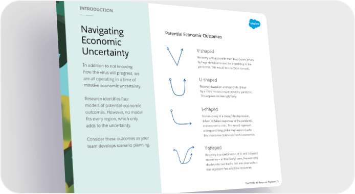 INTRODUCTION Navigating Potential Economic Outcomes Economic V-shaped Uncertainty Recovery with a possible short lived boom, driven by huge stimulus needed for a hard stop to the In addition to not knowing pandemic. This would be a surprise scenario. how the virus will progress, we U-shaped are all operating in a time of massive economic uncertainty. Recovery based on a longer crisis, driven by a more modest response to the pandemic. This appears increasingly likely. Research identifies four models of potential economic L-shaped outcomes. However, no model fits every region, which only Non-recovery of a decay into depression, driven by failed responses to the pandemic adds to the uncertainty. and economic crisis. This would represent a deep and long global depression due to Consider these outcomes as your the interconnectedness of world economies. team develops scenario planning. Y-shaped Recovery is a combination of U- and L-shaped recoveries — in this (likely) case, the economy divides into two tracks: fast and slow sectors that represent fast and slow recoveries. The COVID-19 Response Playbook | 5