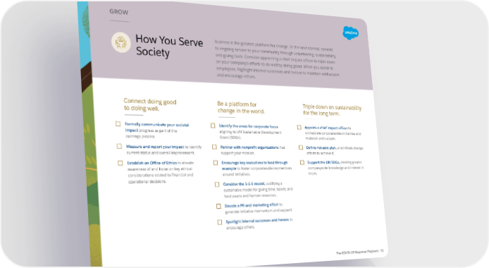 GROW How You Serve Business is the greatest platform for change. In the next normal, commit to ongoing service to your community through volunteering, sustainability, Society and giving back. Consider appointing a chief impact officer to triple down on your company’s efforts to do well by doing good. When you speak to employees, highlight internal successes and heroes to maintain enthusiasm and encourage others. Connect doing good Be a platform for Triple down on sustainability to doing well. change in the world. for the long term. Formally communicate your societal Identify the areas for corporate focus Appoint a chief impact officer to impact progress as part of the aligning to UN Sustainable Development orchestrate corporatewide initiatives and earnings process. Goals (SDGs). maintain enthusiasm. Measure and report your impact to identify Partner with nonprofit organizations that Define net-zero plan, and initiate change current status and overall improvement. support your mission. efforts to achieve it. Establish an Office of Ethics to elevate Encourage key executives to lead through Support the UN SDGs, creating greater awareness of and focus on key ethical example to foster corporatewide momentum companywide knowledge and interest in considerations related to financial and around initiatives. them. operational decisions. Consider the 1-1-1 model, codifying a sustainable model for giving time, talent, and hard assets and human resources. Devote a PR and marketing effort to generate initiative momentum and support. Spotlight internal successes and heroes to encourage others. The COVID-19 Response Playbook | 31