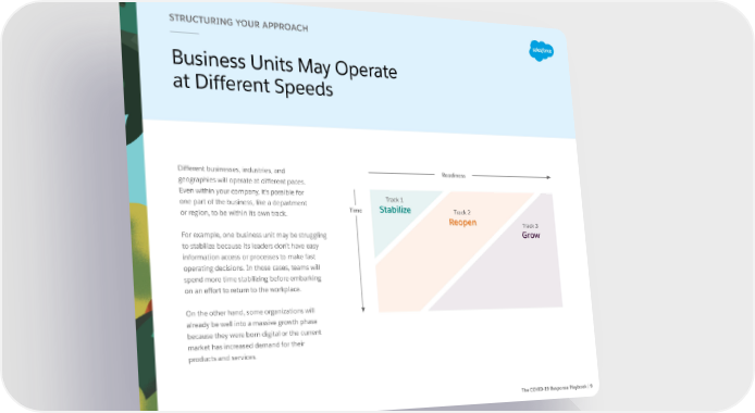 STRUCTURING YOUR APPROACH Business Units May Operate at Different Speeds Different businesses, industries, and Readiness geographies will operate at different paces. Even within your company, it’s possible for Track 1 one part of the business, like a department Stabilize or region, to be within its own track. Time Track 2 Reopen Track 3 For example, one business unit may be struggling Grow to stabilize because its leaders don’t have easy information access or processes to make fast operating decisions. In those cases, teams will spend more time stabilizing before embarking on an effort to return to the workplace. On the other hand, some organizations will already be well into a massive growth phase because they were born digital or the current market has increased demand for their products and services. The COVID-19 Response Playbook | 9