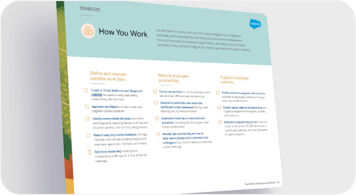 STABILIZE Use this time to develop and execute a plan to support your employees’ How You Work wellbeing, while ensuring they can stay productive in new environments. Prioritize their physical and psychological safety. You’ll likely have to rethink processes, tools, and technology as you evolve your traditional ways of working. Define and execute Rebuild employee Support employee stabilize work plan. productivity. wellness. Create a “Crisis Taskforce and Response” Ensure connectivity for remote employees with Clarify assistance programs and resources V2MOM focused on employee safety, secure email, VPN, and web conferencing. available to employees (childcare, financial productivity, and wellness. planning, mental health). Streamline workflows and automate Segment workforce to enable clear and inefficient human processes (billing, order Create regular cadence of storytelling with targeted communications. tracking, etc.) to remove friction. insights and tips from employees, experts, and customers. Clearly communicate the plan, tailored to Implement training for new tools and each segment, ensuring steady and frequent processes, including decision support and Establish employee help portal to provide situation updates, new policies, and guidance. virtual collaboration. access to all services (IT, HR, finance, etc.); identify and prioritize new offerings based Make it easy to provide feedback, through Provide tips and training on how to on query analytics. multiple, low-friction channels (respond to best communicate with customers and employee questions, feedback, and ideas). colleagues (e.g., build empathy and provide active listening). Reinforce leadership visibility and transparency with regular virtual all-hands meetings. The COVID-19 Response Playbook | 15