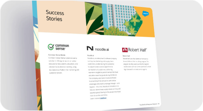 Success Customer Stories Features Common Sense Media Noodle.ai Robert Half Common Sense Media turned around a Noodle.ai, an enterprise AI software company Robert Half uses the Salesforce Platform for solution in 10 days to launch an online serving manufacturing and supply chain its new Hello to Hire recruiting program. The resource to help parents, educators, and customers, pivoted during this pandemic program rapidly places qualified furloughed children to do distance learning, using to adjust its data science algorithms to retail workers with call center positions to meet the Salesforce Platform for marketing and be helpful to its customers, delivering high demand for remote service agents. customer service. near-term insights to predict demand for food and other essential goods during COVID-19. The company uses Sales Cloud and Pardot to proactively find companies with similar challenges who want to manage through – and beyond – this crisis. Noodle.ai’s intention is to help our planet keep supply chains running and essential goods flowing to the people that need them to survive and thrive. Learn more at noodle.ai. The COVID-19 Response Playbook | 25