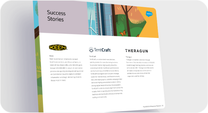 Success Stories Keen TentCraft Theragun Keen launched an initiative to connect TentCraft, a custom tent manufacturer, Theragun connected customers through healthcare workers, and those at home, in quickly pivoted its manufacturing business Commerce Cloud to drive donations of 250,000 need of new shoes with up to 100,000 pairs to provide mobile, high-quality drive-thru meals through Feeding America, and now are (about $10,000,000 in value). A nomination screening tents for healthcare professionals set to donate 300+ Theraguns and thousands process was quickly developed and launched on the front lines of COVID-19 relief efforts. of masks to hospitals around the world in on Commerce Cloud to capture customer TentCraft leveraged Sales Cloud to manage addition to exclusive discounts for first information and begin delivering shoes to customer relationships, and Pardot to build, responders and the military. those most in need. test, and deploy quick, scalable campaigns that delivered highly personalized content. With a strong digital footprint across the ecosystem, TentCraft is able to ensure alignment across the supply chain to quickly pivot its manufacturing business and build safe and secure temporary testing environments. The COVID-19 Response Playbook | 32