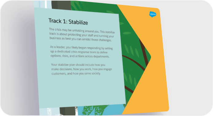 Track 1: Stabilize The crisis may be unfolding around you. This stabilize track is about protecting your staff and running your business as best you can amidst those challenges. As a leader, you likely began responding by setting up a dedicated crisis response team to define options, risks, and actions across departments. Your stabilize plan should include how you make decisions, how you work, how you engage customers, and how you serve society.