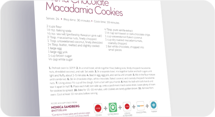Aloha Chocolate Macadamia Cookies 2 sticks butter (1/2 cup) Serves: 24 Prep time: 30 minutes Cook time: 18 minutes • • 2 cups flour 4 Tbsp. pure vanilla extract 1/2 tsp. baking soda 11/2 cup semisweet or dark chocolate chips 3/4 cup chopped nuts (e.g., walnuts, pecans, and/or cashews) 1/2 tsp. sea salt (preferably Hawaiian pink salt) 1 cup unsweetened flaked coconut 3 Tbsp. macadamia nuts, finely chopped 1 cup dry roasted macadamia nuts, 1 Tbsp. unsweetened coconut, finely shredded coarsely chopped 14 Tbsp. butter, melted and slightly cooled 1 bar white chocolate, chopped into 1 large egg small pieces 1 large egg yolk 1 cup brown sugar 1/4 cup white sugar 1. Preheat oven to 325°F. 2. In a small bowl, whisk together flour, baking soda, finely chopped macadamia nuts, shredded coconut, and salt. Set aside. 3. In a separate bowl, mix together butter and both sugars until light and fluffy, about 3–5 minutes. 4. Beat in egg, egg yolk, and vanilla until smooth. 5. Mix in the flour mixture until combined. 6. Stir in chocolate chips, white chocolate, flaked coconut, and coarsely chopped macadamia nuts. 7. Using about 1/2 cup of the dough, form a ball with your hands. 8. Hold the ball with both hands and tear it apart in half. 9. Place each half, torn side up, onto a parchment-lined cookie sheet. Leave plenty of room for cookies to spread. 10. Bake for 15–18 minutes, until cookies are barely golden brown. 11. Remove from oven. Cool at least 10 minutes before serving. RECIPE AND APP STACK FROM MONICA SANDBERG @NOTISBLANK + + + + “Combine these sales and service apps for data management and document CONGA GETFEEDBACK CONGA RINGCENTRAL TASKRAY generation plus call center integration COMPOSER ACTIONGRID and survey feedback.” 28
