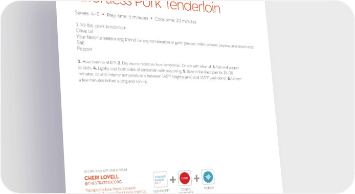 Effortless Pork Tenderloin Serves: 4–6 Prep time: 5 minutes Cook time: 20 minutes • • 1 1/2 lbs. pork tenderloin Olive oil Your favorite seasoning blend (or any combination of garlic powder, onion powder, paprika, and dried herbs) Salt Pepper 1/2 red onion, thinly sliced 1. Heat oven to 400°F. 2. Dry excess moisture from tenderloin. Drizzle with olive oil. 3. Salt and pepper to taste. 4. Lightly coat both sides of tenderloin with seasoning. 5. Bake in foil-lined pan for 18–20 minutes, or until interior temperature is between 145°F (slightly pink) and 155°F (well-done). 6. Let rest a few minutes before slicing and serving. RECIPE AND APP STACK FROM CHERI LOVELL nonprofit @THESTRATEGICORG success pack + + “Nonprofits love these because Nonprofit Success Pack tracks metrics, NONPROFIT CONGA TASKRAY Conga Composer thanks donors, SUCCESS PACK COMPOSER and TaskRay manages projects.” 16