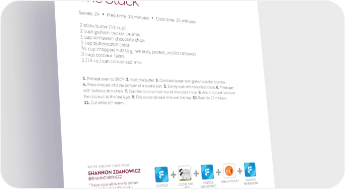 The Stack Serves: 24 Prep time: 15 minutes Cook time: 25 minutes • • 2 sticks butter (1/2 cup) 2 cups graham cracker crumbs 1 cup semisweet chocolate chips 1 cup butterscotch chips 1/2 tsp. baking soda 11/2 cup semisweet or dark chocolate chips 3/4 cup chopped nuts (e.g., walnuts, pecans, and/or cashews) 1/2 tsp. sea salt (preferably Hawaiian pink salt) 2 cups coconut flakes 1 (14-oz.) can condensed milk 1. Preheat oven to 350°F. 2. Melt the butter. 3. Combine butter with graham cracker crumbs. 4. Press mixture into the bottom of a cookie pan. 5. Evenly coat with chocolate chips. 6. Then layer with butterscotch chips. 7. Sprinkle coconut over top of chocolate chips. 8. Add chopped nuts over 1/4 cup white sugar the coconut as the last layer. 9. Drizzle condensed milk over the top. 10. Bake for 25 minutes. 11. Cut while still warm. Using about 1/2 cup of the dough, form a ball with your hands. RECIPE AND APP STACK FROM SHANNON ZDANOWICZ @SHANNONRENEEZ + + + + “These apps allow me to deliver the right functionality to our FONTEVA CLONE THIS FONTEVA DEMANDTOOLS FONTEVA members — with confidence.” EVENTS USER MEMBERSHIP FRAMEWORK 29