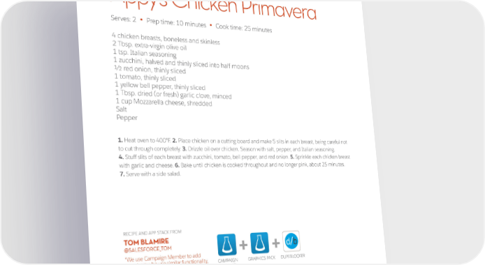Appy’s Chicken Primavera Serves: 2 Prep time: 10 minutes Cook time: 25 minutes • • 1 1/2 lbs. pork tenderloin 4 chicken breasts, boneless and skinless 2 Tbsp. extra-virgin olive oil 1 tsp. Italian seasoning 1 zucchini, halved and thinly sliced into half moons 1/2 red onion, thinly sliced 1 tomato, thinly sliced 1 yellow bell pepper, thinly sliced 1 Tbsp. dried (or fresh) garlic clove, minced 1 cup Mozzarella cheese, shredded Salt Pepper 1. Heat oven to 400°F. 2. Place chicken on a cutting board and make 5 slits in each breast, being careful not to cut through completely. 3. Drizzle oil over chicken. Season with salt, pepper, and Italian seasoning. 4. Stuff slits of each breast with zucchini, tomato, bell pepper, and red onion. 5. Sprinkle each chicken breast with garlic and cheese. 6. Bake until chicken is cooked throughout and no longer pink, about 25 minutes. 7. Serve with a side salad. RECIPE AND APP STACK FROM TOM BLAMIRE @SALESFORCE_TOM + + “We use Campaign Member to add members who use similar functionality, CAMPAIGN GRAPHICS PACK DUPEBLOCKER Graphics Pack to visualize values, and MEMBER Dupeblocker to block dupes.” 17