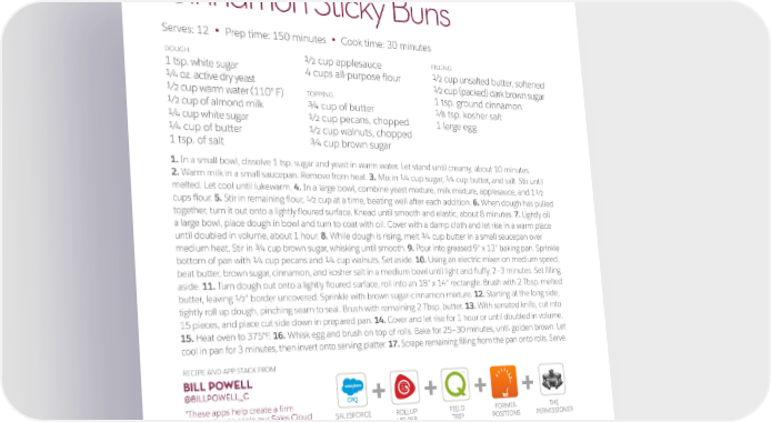 Cinnamon Sticky Buns Serves: 12 Prep time: 150 minutes Cook time: 30 minutes • • DOUGH ½ cup applesauce FILLING 1 tsp. white sugar 4 cups all-purpose flour 1/2 cup unsalted butter, softened ¼ oz. active dry yeast 1/2 cup (packed) dark brown sugar ½ cup warm water (110° F) TOPPING 1 tsp. ground cinnamon ½ cup of almond milk ¾ cup of butter 1/8 tsp. kosher salt ¼ cup white sugar ½ cup pecans, chopped 1 large egg ¼ cup of butter ½ cup walnuts, chopped 1 tsp. of salt ¾ cup brown sugar 1. In a small bowl, dissolve 1 tsp. sugar and yeast in warm water. Let stand until creamy, about 10 minutes. 2. Warm milk in a small saucepan. Remove from heat. 3. Mix in 1/4 cup sugar, 1/4 cup butter, and salt. Stir until melted. Let cool until lukewarm. 4. In a large bowl, combine yeast mixture, milk mixture, applesauce, and 11/2 cups flour. 5. Stir in remaining flour, 1/2 cup at a time, beating well after each addition. 6. When dough has pulled together, turn it out onto a lightly floured surface. Knead until smooth and elastic, about 8 minutes. 7. Lightly oil a large bowl, place dough in bowl and turn to coat with oil. Cover with a damp cloth and let rise in a warm place until doubled in volume, about 1 hour. 8. While dough is rising, melt 3/4 cup butter in a small saucepan over medium heat. Stir in 3/4 cup brown sugar, whisking until smooth. 9. Pour into greased 9" x 13" baking pan. Sprinkle bottom of pan with 1/4 cup pecans and 1/4 cup walnuts. Set aside. 10. Using an electric mixer on medium speed, beat butter, brown sugar, cinnamon, and kosher salt in a medium bowl until light and fluffy, 2–3 minutes. Set filling aside. 11. Turn dough out onto a lightly floured surface, roll into an 18" x 14" rectangle. Brush with 2 Tbsp. melted butter, leaving 1/2" border uncovered. Sprinkle with brown sugar-cinnamon mixture. 12. Starting at the long side, tightly roll up dough, pinching seam to seal. Brush with remaining 2 Tbsp. butter. 13. With serrated knife, cut into 15 pieces, and place cut side down in prepared pan. 14. Cover and let rise for 1 hour or until doubled in volume. 15. Heat oven to 375°F. 16. Whisk egg and brush on top of rolls. Bake for 25–30 minutes, until golden brown. Let cool in pan for 3 minutes, then invert onto serving platter. 17. Scrape remaining filling from the pan onto rolls. Serve. RECIPE AND APP STACK FROM BILL POWELL TM @BILLPOWELL__C + + + + “These apps help create a firm foundation to scale our Sales Cloud SALESFORCE ROLLUP FIELD FORMER THE org on, help with cleanup, and boost CPQ HELPER TRIP POSITIONS PERMISSIONER productivity.” 30