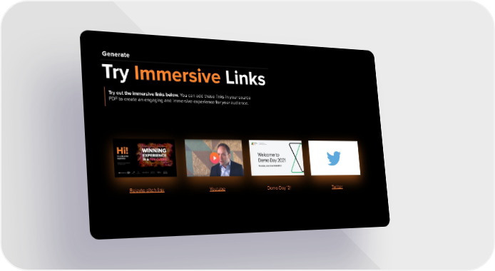 Generate Try Immersive Links Try out the immersive links below. You can add these links in your source PDF to create an engaging and immersive experience for your audience. Relayto pitch link Youtube Demo Day ’21 Twitter