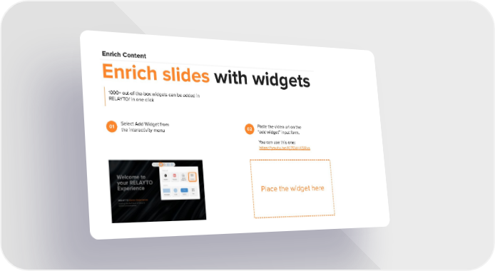 Enrich Content Enrich slides with widgets 1000+ out-of-the-box widgets can be added in RELAYTO/ in one click Select Add Widget from Paste the video url on the 01 02 the interactivity menu “add widget” input form. You can use this one: https://youtu.be/Kj7EkHKSRxs Place the widget here