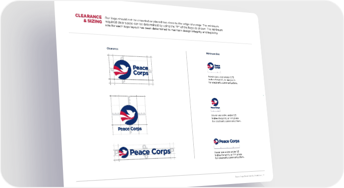 CLEARANCE Our logo should not be crowded or placed too close to the edge of a page. The minimum & SIZING required clear space can be determined by using the āPā of the logo as shown. The minimum size for each logo layout has been determined to maintain design integrity and legibility. Clearance Minimum Size Never use a size under 0.73 inches for print, or 144 pixels for electronic communications. Never use a size under 0.5 inches for print, or 144 pixels for electronic communications. Never use a size under 1.5 inches for print, or 144 pixels for electronic communications. Peace Corps Brand Identity Guidelines | 6