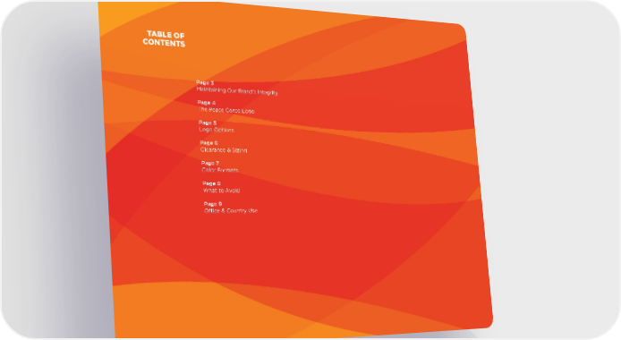 Peace Corps Brand Book Page 1 Page 3TABLE OF CONTENTS Page 3 Maintaining Our Brand’s Integrity Page 4 The Peace Corps Logo Page 5 Logo Options Page 6 Clearance & Sizing Page 7 Color Formats Page 8 What to Avoid Page 9 Office & Country Use