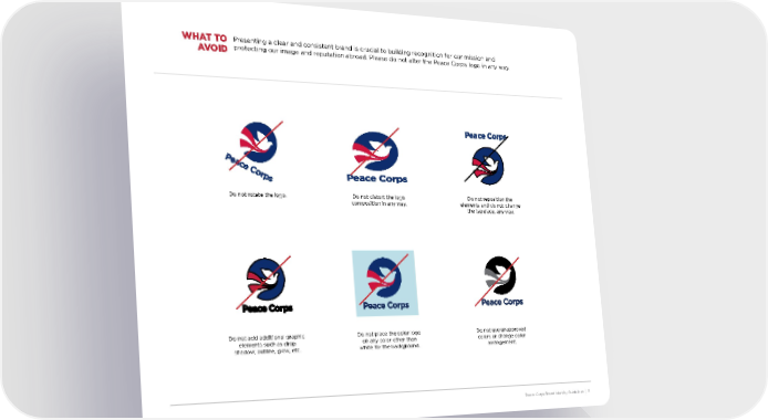 WHAT TO Presenting a clear and consistent brand is crucial to building recognition for our mission and AVOID protecting our image and reputation abroad. Please do not alter the Peace Corps logo in any way. Do not rotate the logo. Do not distort the logo Do not reposition the composition in any way. elements and do not change the typeface. any way. Do not add additional graphic Do not place the color logo Do not use unapproved elements such as drop on any color other than colors or change color shadow, outline, glow, etc. white for the background. arrangement. Peace Corps Brand Identity Guidelines | 8