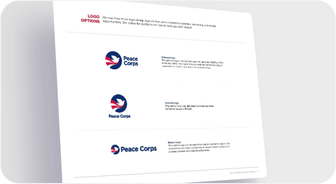 LOGO We now have three logo design layouts that were created to optimize marketing and media OPTIONS opportunities. See below for guidance on how to best use each layout. Primary Logo The primary logo is designed to provide optimum visibility of the mark and name. This layout should work well for the majority of opportunities and is considered our standard logo. Vertical Logo The vertical logo was designed for instances when horizontal space is limited. Banner Logo The banner logo was designed for narrow horizontal spaces and to maximize our name recognition in longer format layouts such as event banners and website ad banners. Peace Corps Brand Identity Guidelines | 5