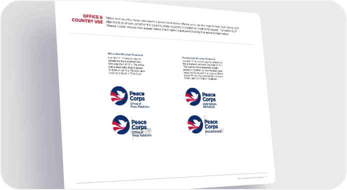 OFFICE & Office and country name placement is prescribed below. Please only use the logo format, font sizing, and COUNTRY USE alignment as shown, whether the country name appears in English or another language. Translations of “Peace Corps” should now appear below the English logotype following the same format below. Office Identification Treatment Country Identification Treatment Use the “P” in Peace Corps to Use the “P” in Peace Corps to determine determine the placement and the placement and font size (half of “P”). font size (half of “P”). The office The country name treatment should name treatment should appear appear in Gotham or Arial Regular type- in Gotham or Arial Regular type- faces (not bold) and in all caps as shown faces (not bold) in Title Case above. Follow the same guides for trans- lations and non-English languages. Peace Corps Brand Identity Guidelines | 9
