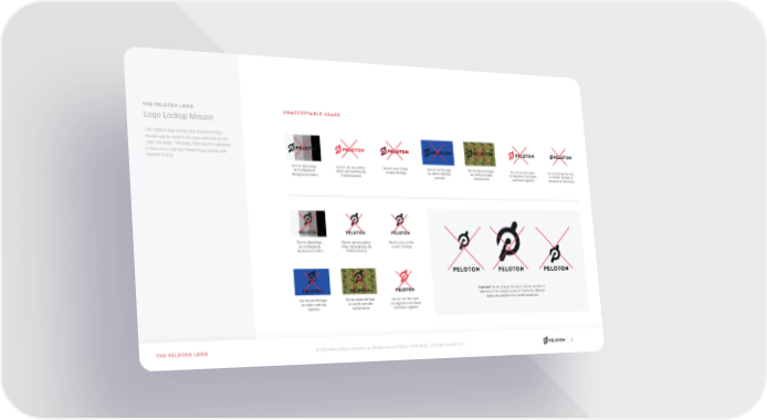 8 © 2020 Peloton, Peloton Interactive, Inc. All rights reserved. Peloton, 125 W 25th St, 11th Fl, New York, NY 10001 Important : Do not change the size or relative position of elements in the stacked version of the lockup. Relative sizing and position must remain consistent. THE PELOTON LOGO UNACCEPTABLE USAGE THE PELOTON LOGO Logo Lockup Misuse The Peloton logo lockup and stacked lockup should only be used in the ways detailed on the Logo Use page. This page lists explicit examples of how not to use the Peloton logo lockup and stacked lockup. Do not put the logo on colors with low contrast Do not put a stroke around the logo Do not use any colors when representing the Peloton lockup Do not use the super red logomark and black wordmark together Do not place the logo on overly complex backgrounds Do not place logo on multicolored background colors Do not put the logo on colors with low contrast Do not put a stroke around the logo Do not use any colors when representing the Peloton lockup Do not use the super red logomark and black wordmark together Do not place the logo on overly complex backgrounds Do not place logo on multicolored background colors Do not change the size or relative position of elements in the lockup