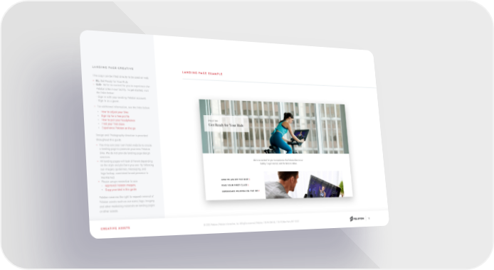 14 © 2020 Peloton, Peloton Interactive, Inc. All rights reserved. Peloton, 125 W 25th St, 11th Fl, New York, NY 10001 LANDING PAGE CREATIVE This copy can be lifted directly to be used on web. • HL: Get Ready for Your Ride • SUB: We’re so excited for you to experience the Peloton Bike in our facility. To get started, visit the links below: - Sign in with y our existing Peloton account. - Sign in as a guest. • For additional information, see the links below: • How to adjust your Bike • Sign Up for a free profile • How to pair your headphones • Find your first class • Experience Peloton on the go Design and Photography direction is provided throughout this guide • You may use your own hotel website to create a landing page t o promote your new Peloton Bik e. We do not provide landing page design services. • All landing pages will look different depending on the style and platform you use. By following our imagery guidelines, messaging, and logo lockup, consistent brand presence is maintained. • Please aways remember to use: • Approved Peloton imagery • Copy provided in this guide Peloton reserves the right to request removal of Peloton assets such as our name, logo, imagery, and other marketing materials on landing pages or other assets. CREATIVE ASSETS LANDING PAGE EXAMPLE We’re so excited for you to experience the Peloton Bike in our facility. To get started, visit the links to below. PELOTON Get Ready for Your Ride HOW TO ADJUST THE BIKE FIND YOUR FIRST CLASS EXPERIENCE PELOTON ON THE GO