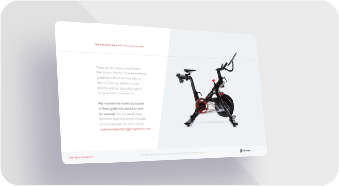 3 © 2019 Peloton, Peloton Interactive, Inc. All rights reserved. Peloton, 125 W 25th St, 11th Fl, New York, NY 10001 THE PELOTON BIKE FOR COMMERCIAL USE THE PELOTON BRAND Thank you for choosing the Peloton Bike for your facility! These promotional guidelines will ensure every rider is aware of the new addition to your property and can take advantage of the great Peloton experience. Any requests for marketing outside of these guidelines should be sent for approval. For any brand usage questions regarding design, signage, printed collateral, etc., reach out to [email protected] .