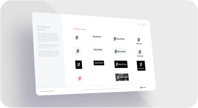 7 © 2020 Peloton, Peloton Interactive, Inc. All rights reserved. Peloton, 125 W 25th St, 11th Fl, New York, NY 10001 THE PELOTON LOGO ACCEPTABLE USAGE THE PELOTON LOGO Logo Use The Peloton logo lockup must always be used in either “Peloton Black” or white, preferably on neutral backgrounds. The logo lockup can be used over imagery or video, but when doing so, make sure there is enough contrast so that the logo remains legible. The wordmark should be used with the same parameters as the lockup, but should not be used over imagery or video. The logomark can be used in the same way as the lockup and the wordmark, but can also be set using Peloton “Super Red.” This is the only logo that can receive this color treatment. DOWNLOAD LOGO FILES
